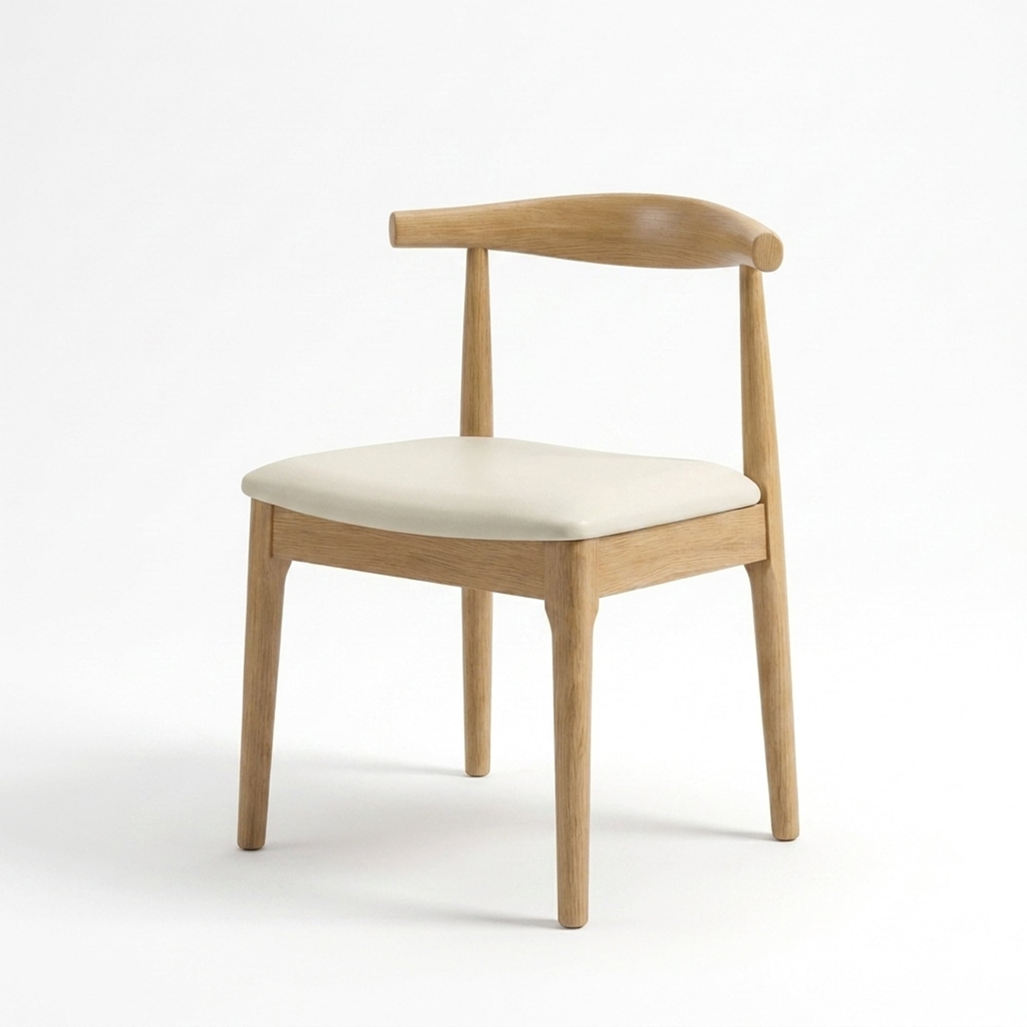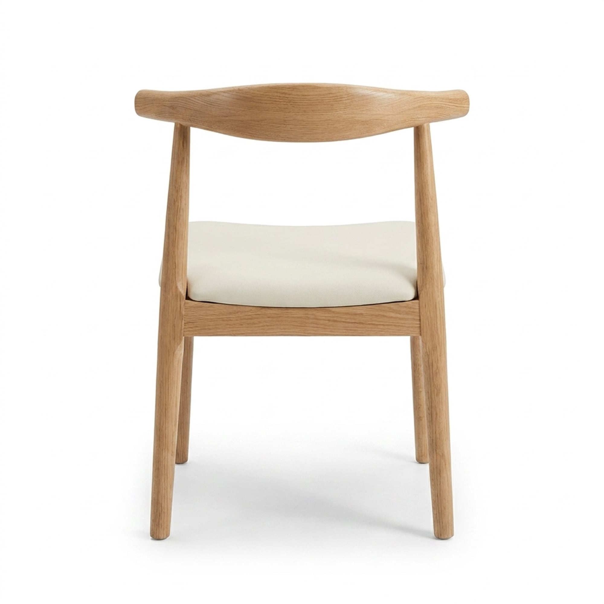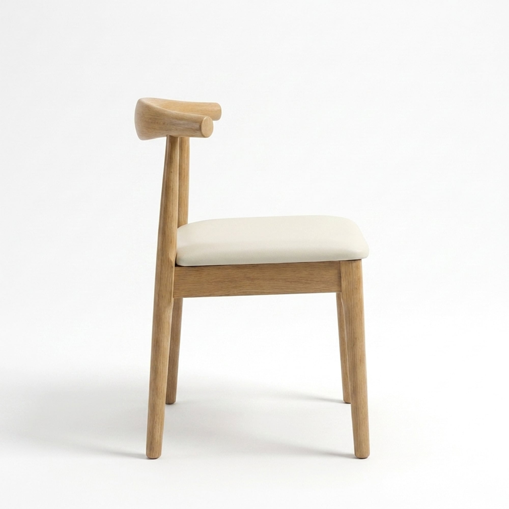 The Luma Oak Wood Dining Chair rests on solid oak legs with a modern silhouette that feels both grounded and refined. Upholstered in smooth vegan leather, it pairs warm ivory tones with a natural wood finish for effortless contrast. Sculptural, sturdy, and thoughtfully designed to elevate everyday dining.