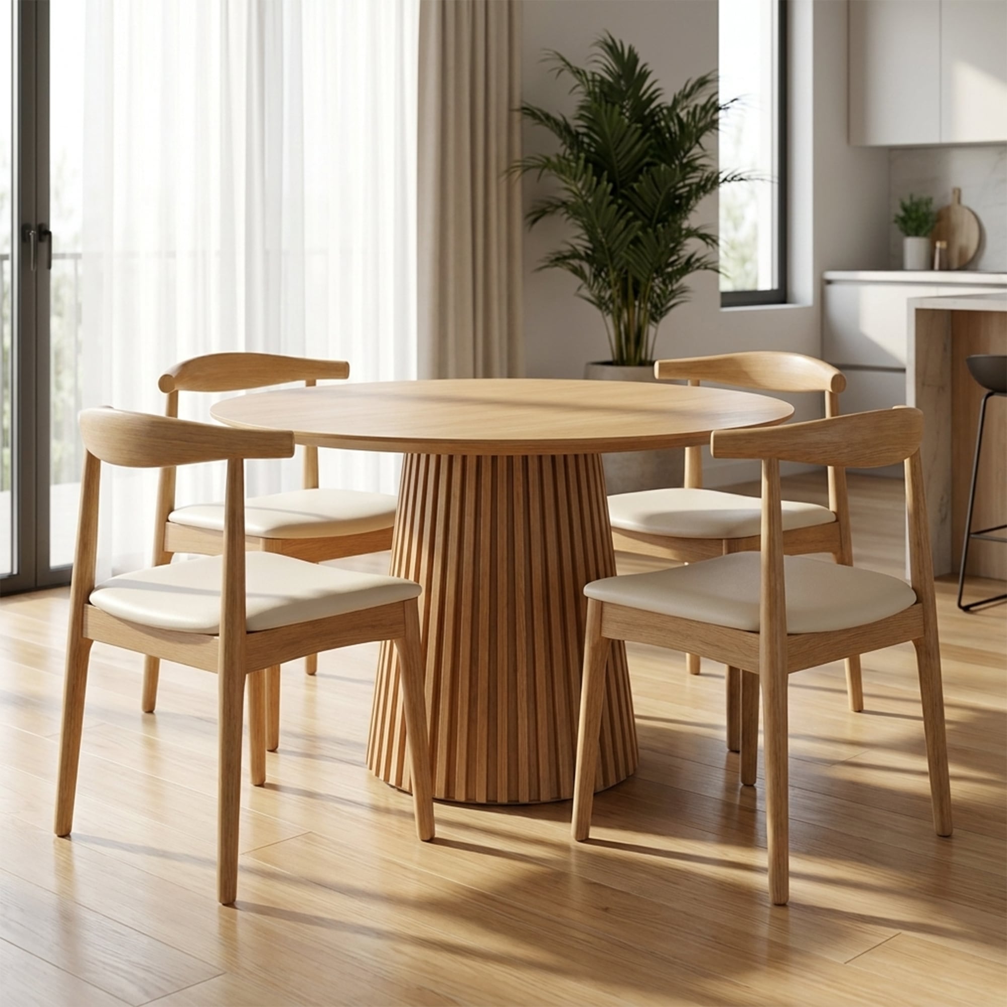Luma Oak Wood Dining Chair blends sculpted form with everyday comfort through a silhouette designed for modern interiors. Crafted from solid oak, its gently curved backrest offers natural support while showcasing the warmth and character of the wood grain. A softly upholstered seat adds comfort and contrast, while clean lines and tapered legs create a refined minimalist presence. Thoughtfully balanced between structure and softness, Luma is designed for lingering dinners, effortless styling, and lasting beauty.